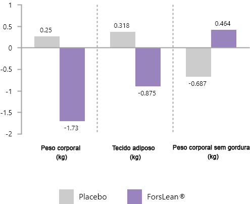 A eficácia de ForsLean® foi confirmada num estudo clínico de dupla ocultação, no qual, após 12 semanas de toma de 250 mg de ForsLean®, foi observada uma diminuição significativa do peso corporal e do teor de gordura e um aumento significativo da massa corporal magra nos indivíduos testados, em comparação com o grupo de placebo.